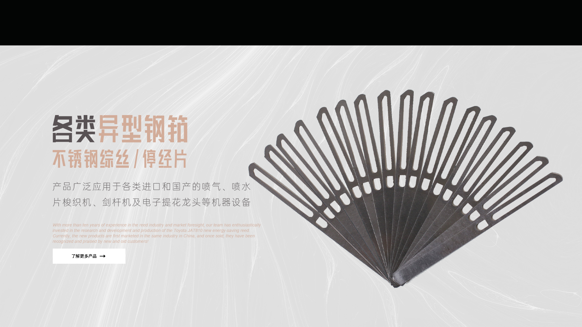 從事研發(fā)生產(chǎn)及銷售各類新型紡織器材的生產(chǎn)型企業(yè)。公司主要產(chǎn)品有:噴氣織機(jī)用各類異型鋼筘(傳統(tǒng)型豐田JAT710鋼筘及新研發(fā)的豐田JAT810節(jié)能筘);不銹鋼綜絲及不銹鋼停經(jīng)片。我們的產(chǎn)品廣泛應(yīng)用于各類進(jìn)口和國產(chǎn)的噴氣、噴水、片梭織機(jī)、劍桿機(jī)及電子提花龍頭等機(jī)器設(shè)備。